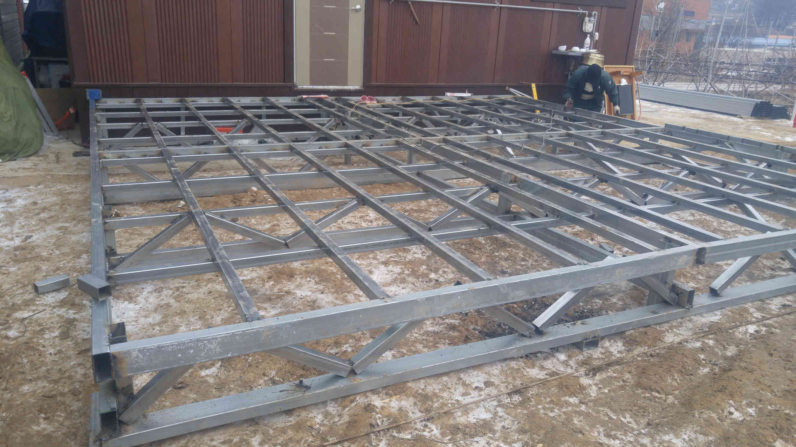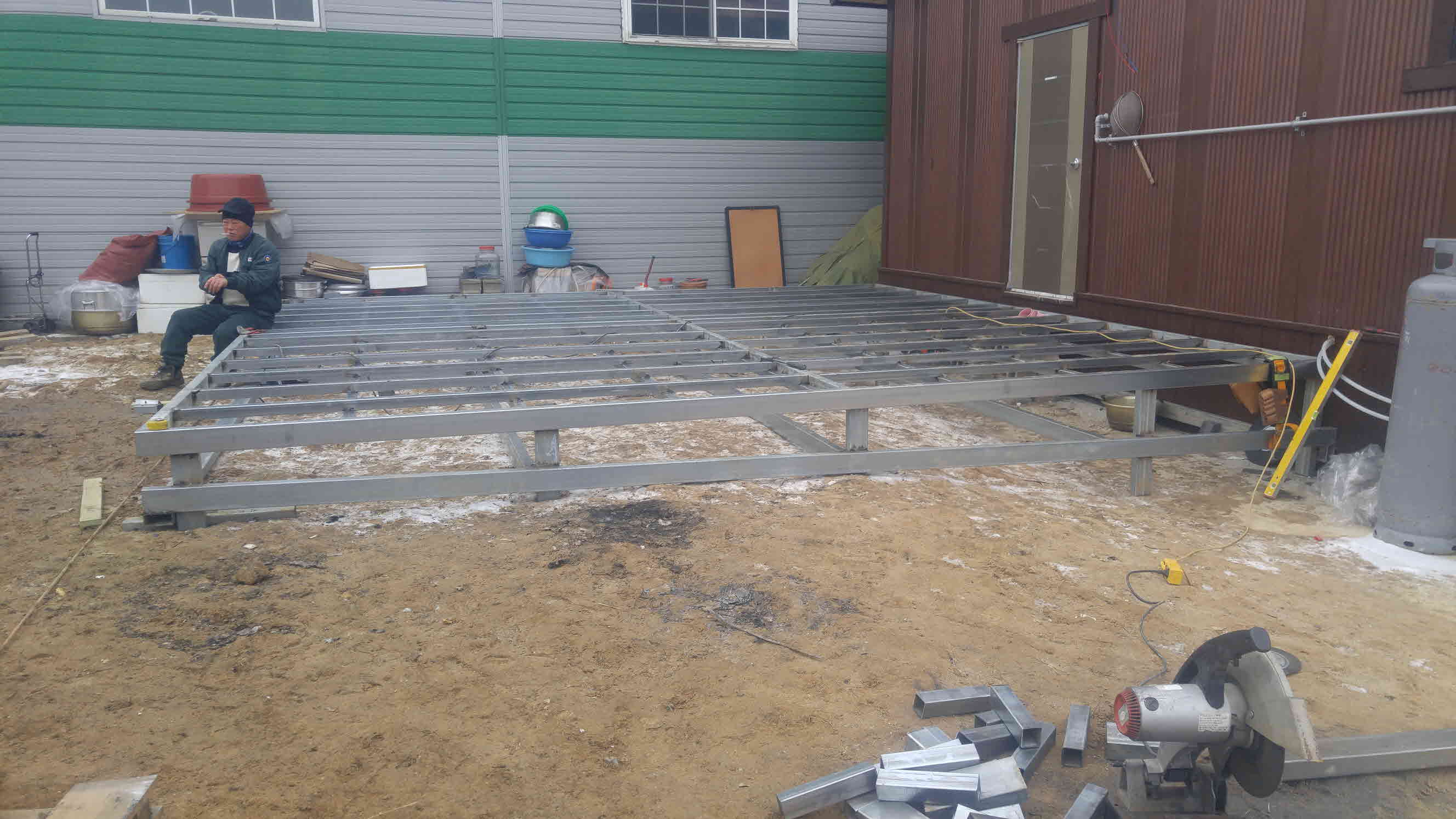 바닥은 구조용 각관으로 틀을 잡고 50T 스티로폼을 두겹 포개서 깔고 상판을 합판으로 마감합니다.