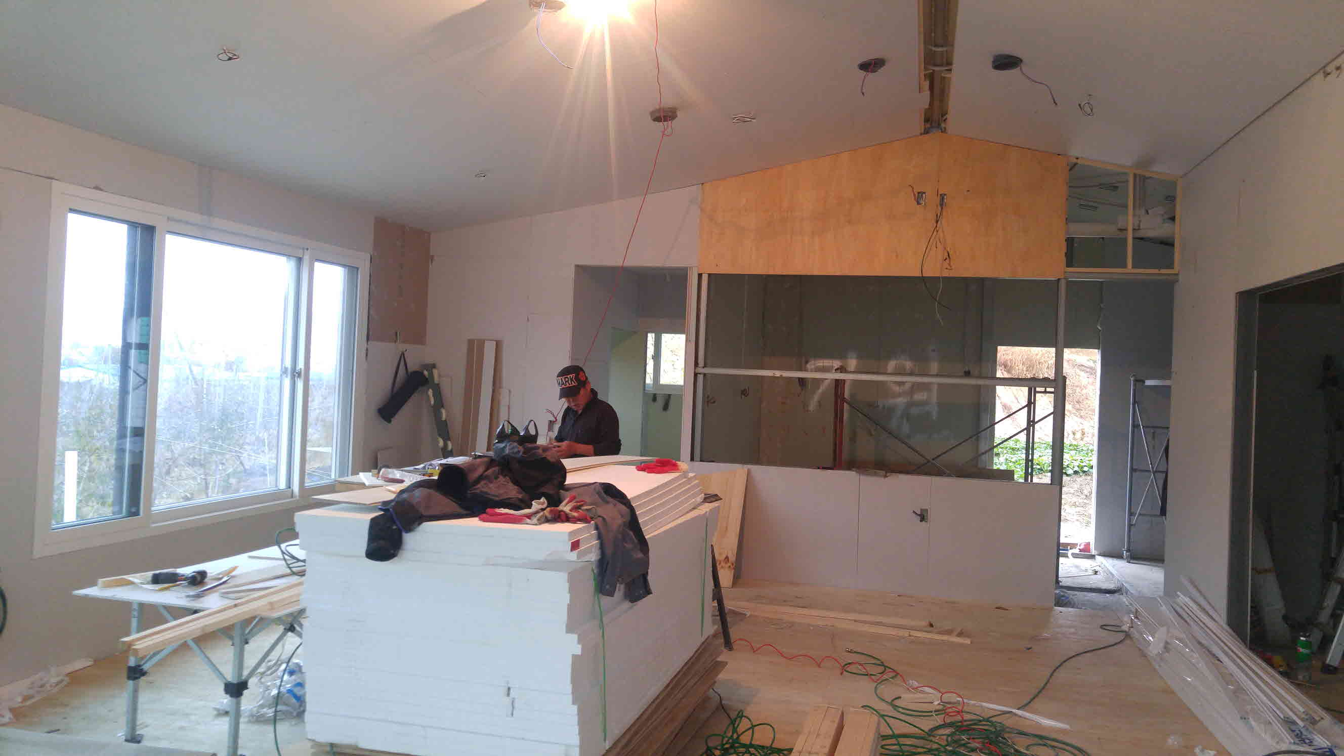 기둥 안쪽으로 다시 목상을 걸고 50m/m 스티로폼을 걸고 석고보드로 마감하니 벽 두께가 210T 가 되네요.