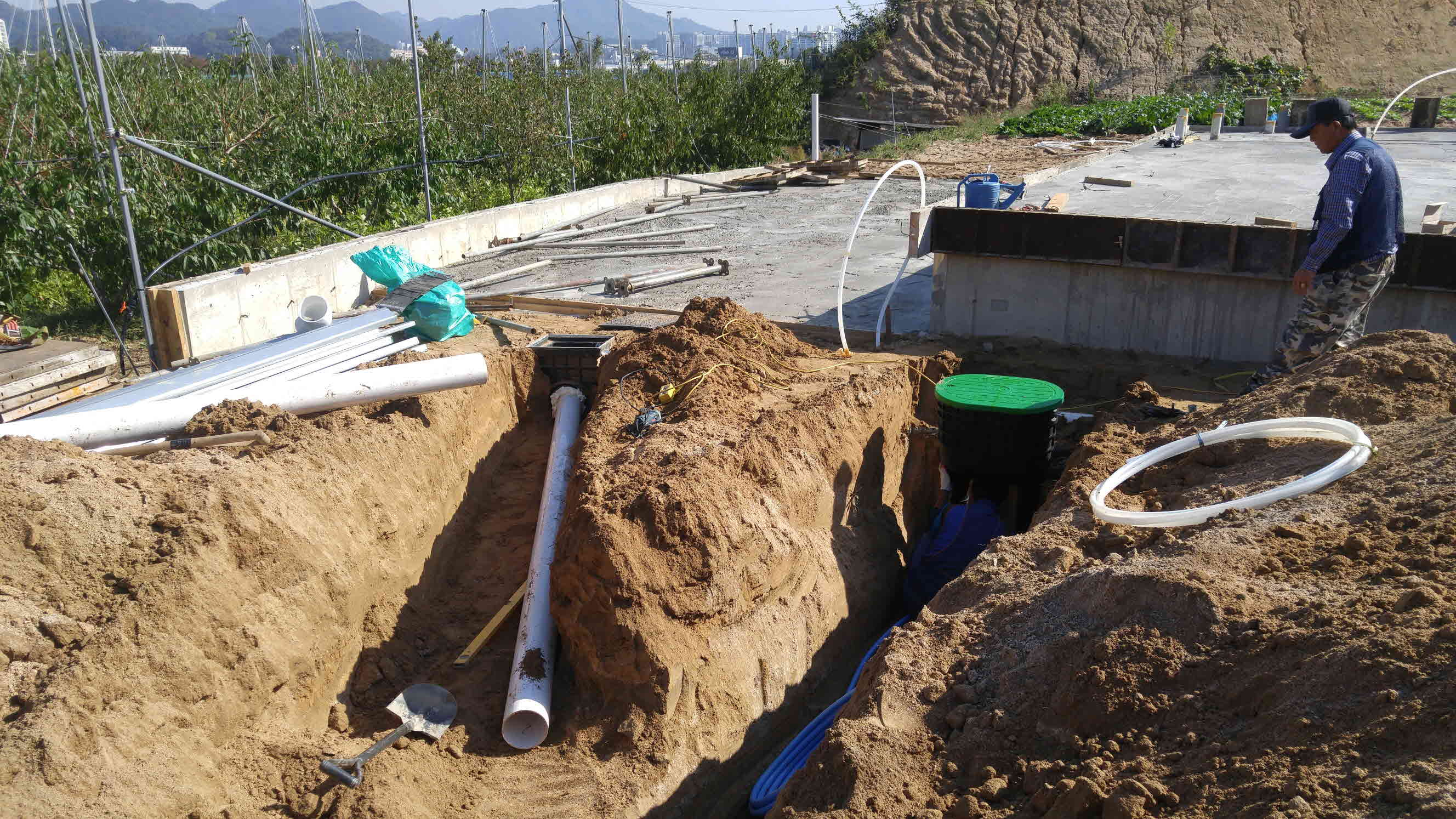 정화조에 배관을 연결하고 정화조에 나온 관은 다시 오수 집수정으로 연결합니다.