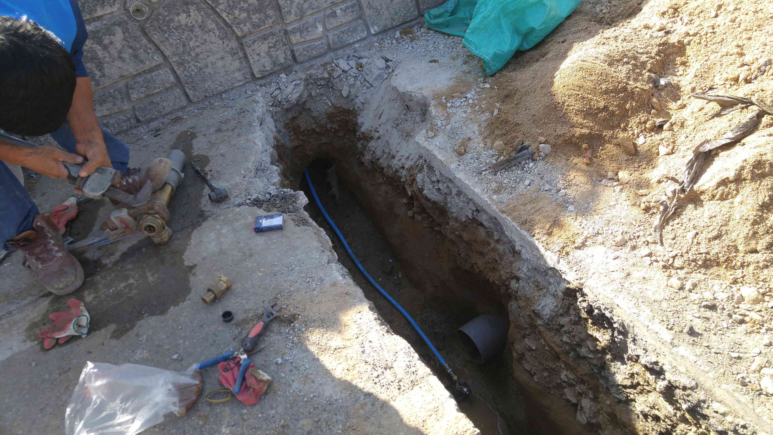 메인 상수도관도 도로 건너편에서 끌고 와야 하니 도로 절개 시간을 맞추어 오수 배관을 함께 설치합니다.