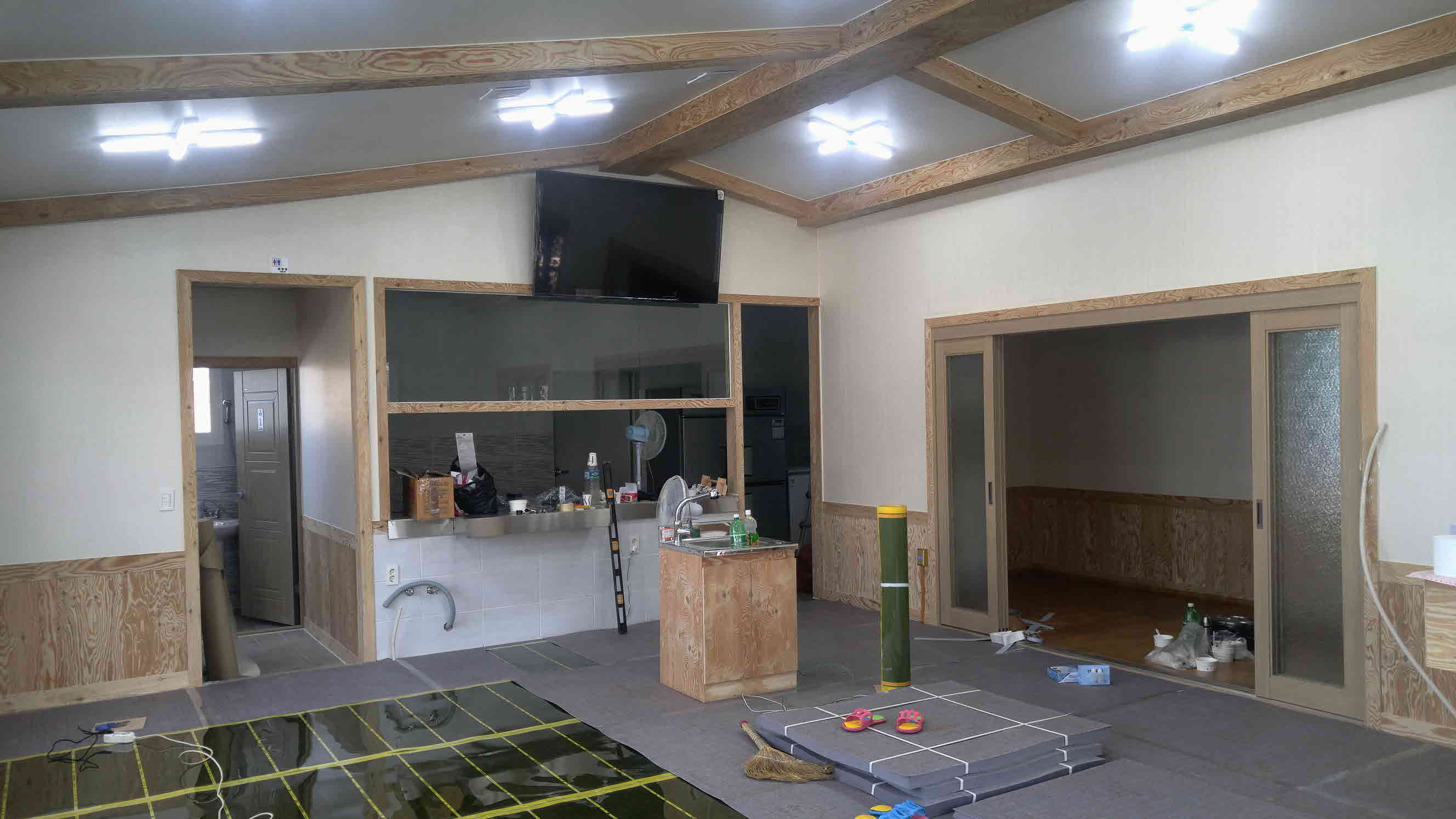 바닥에는 100T 패널을 깔고 합판으로 마감한 후 난방은 필름으로 시공하였습니다.