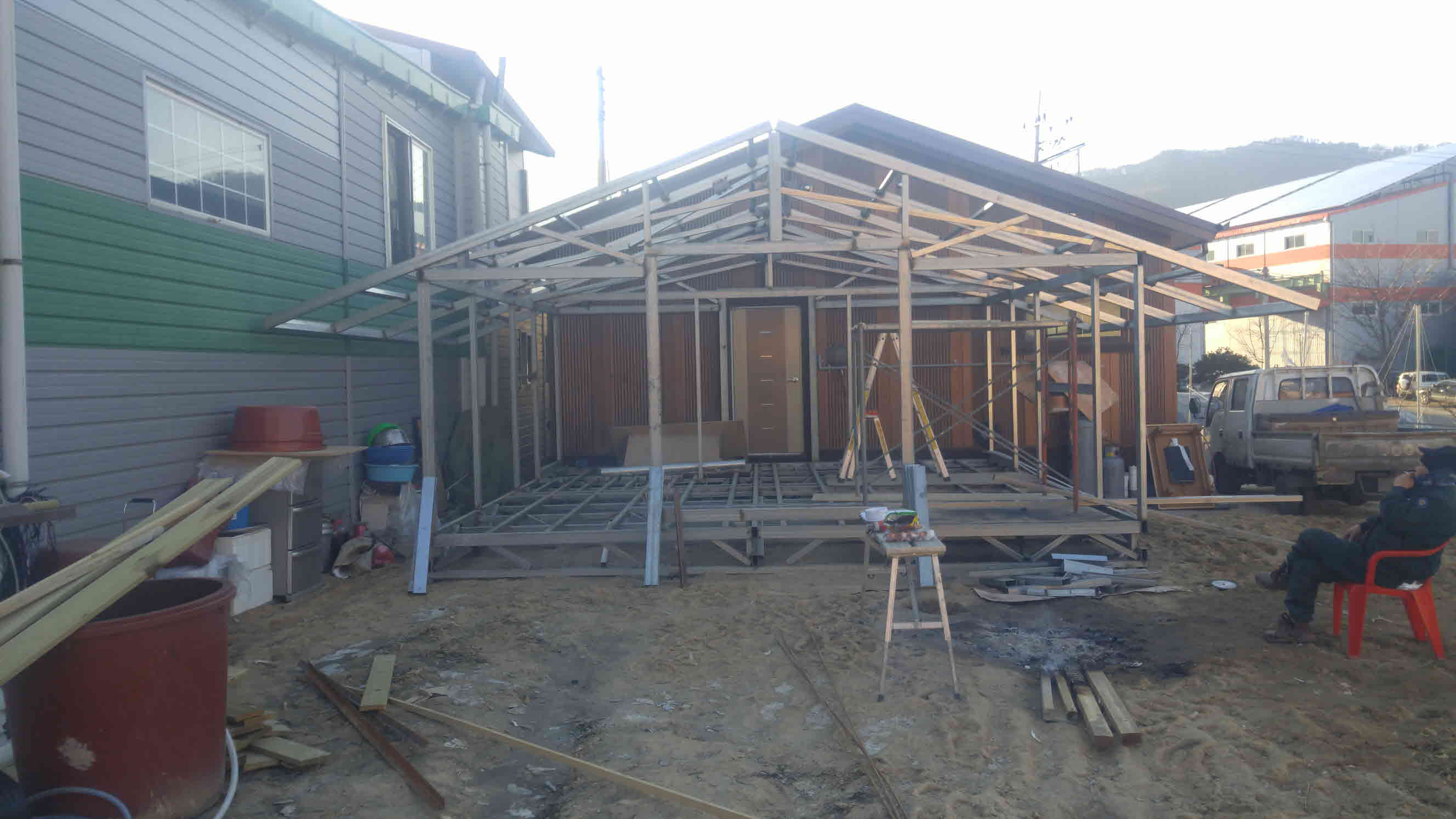 기존 공장건물과 맞닿는 뒷부분은 허드렛 창고로 앞 부분은 여름에 들마루를 놓고