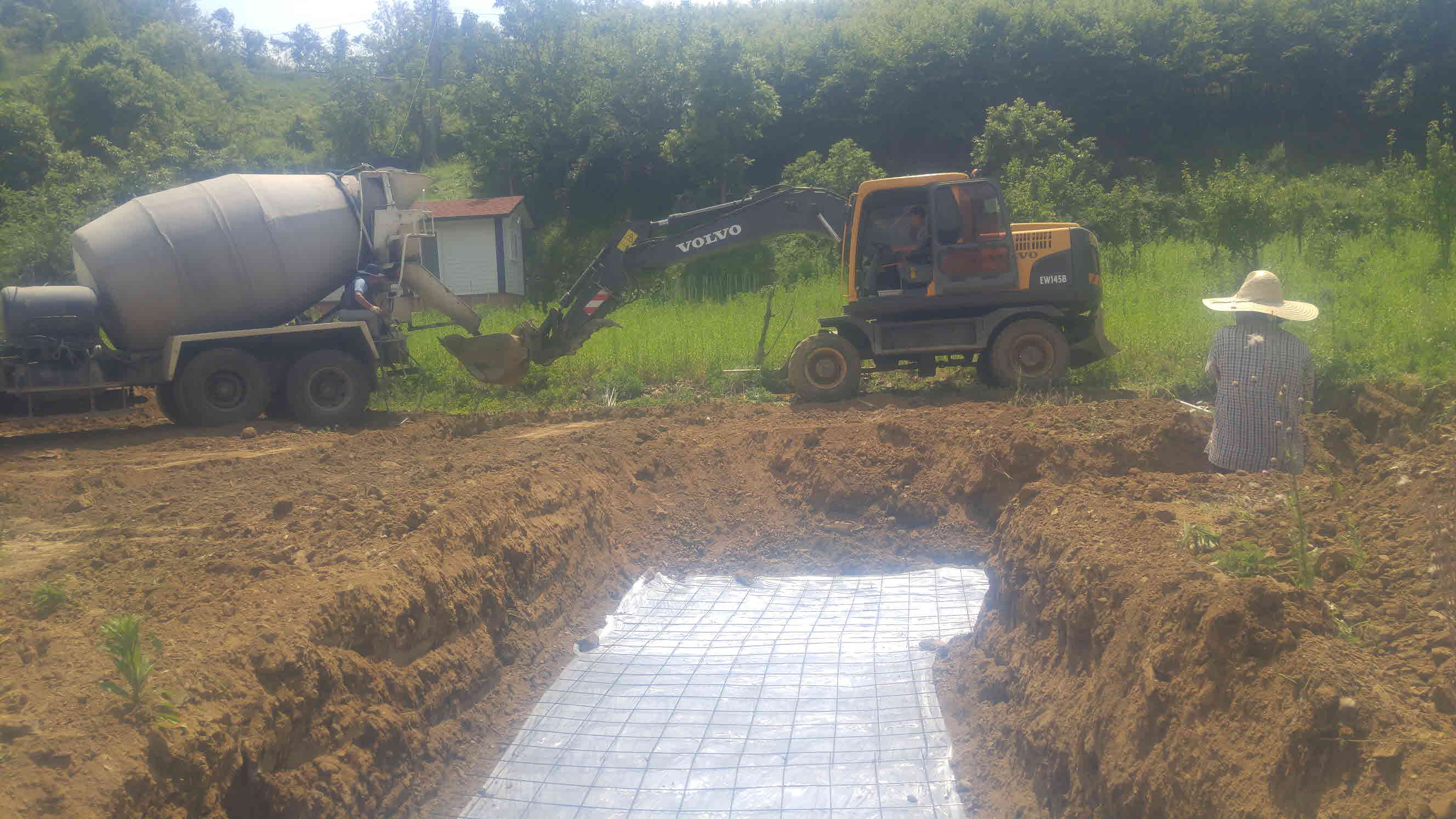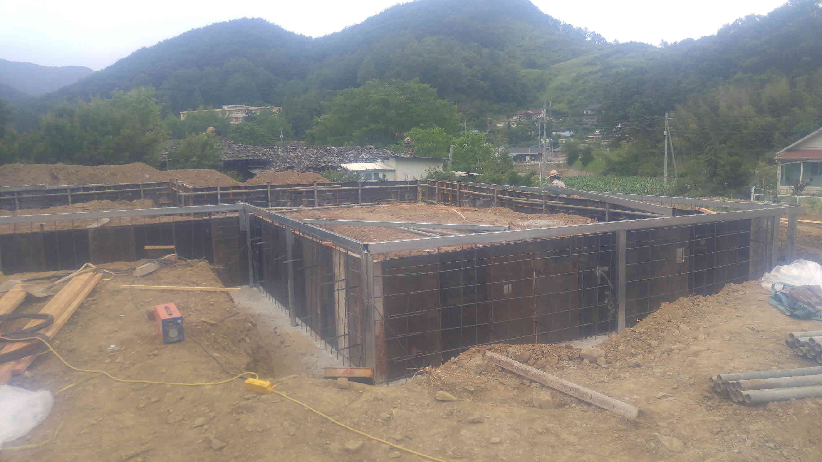 줄 기초를 치기 위해 생땅이 나올 때까지 파서 방수필름과 매쉬를 깔고 버림 콘크리트를 치려고 준비하고 있습니다.