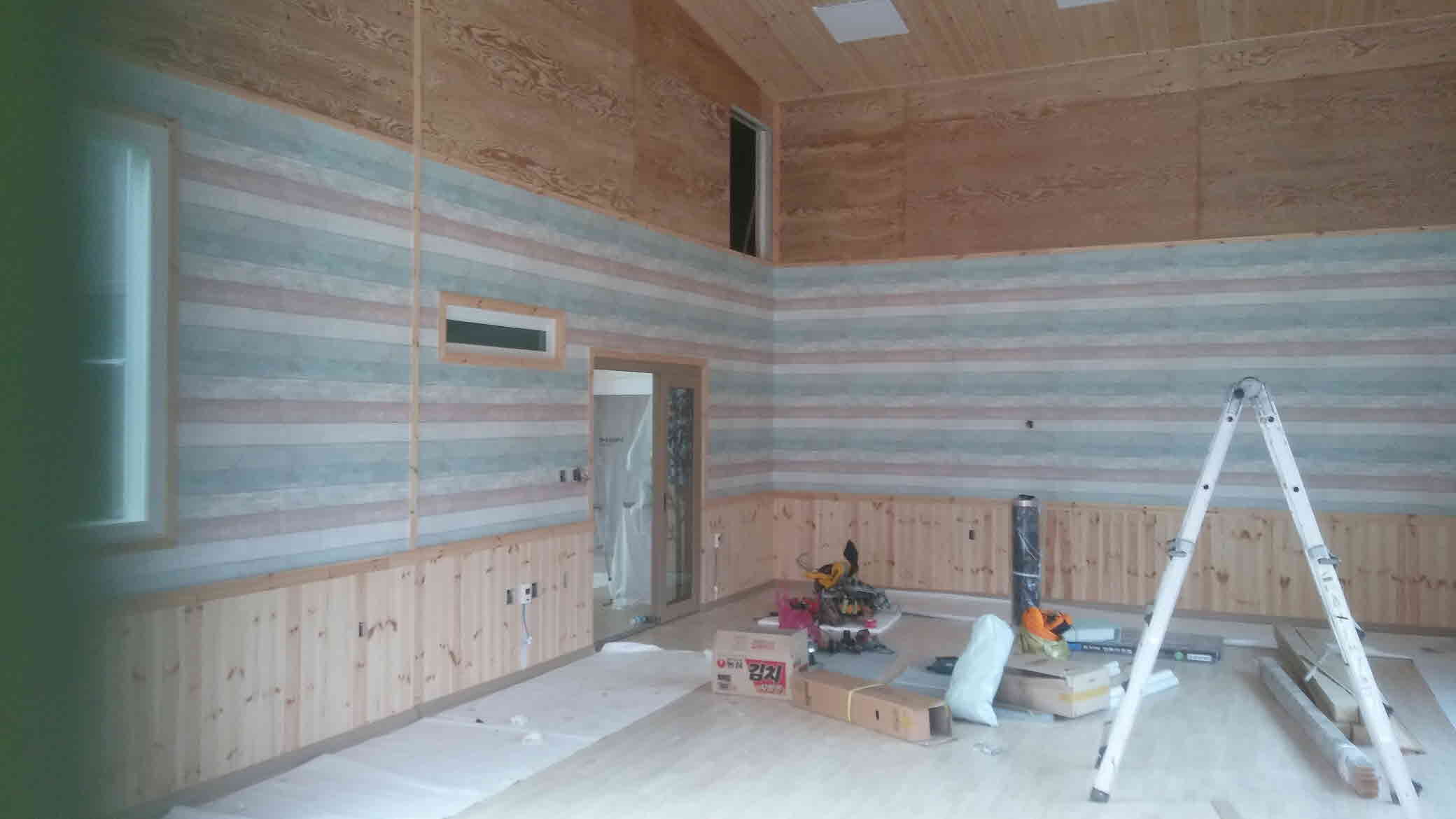 석고보드로 1차 마감, 루바 및 낙엽송 합판, 그리고 도배로 2차 마감하였습니다.