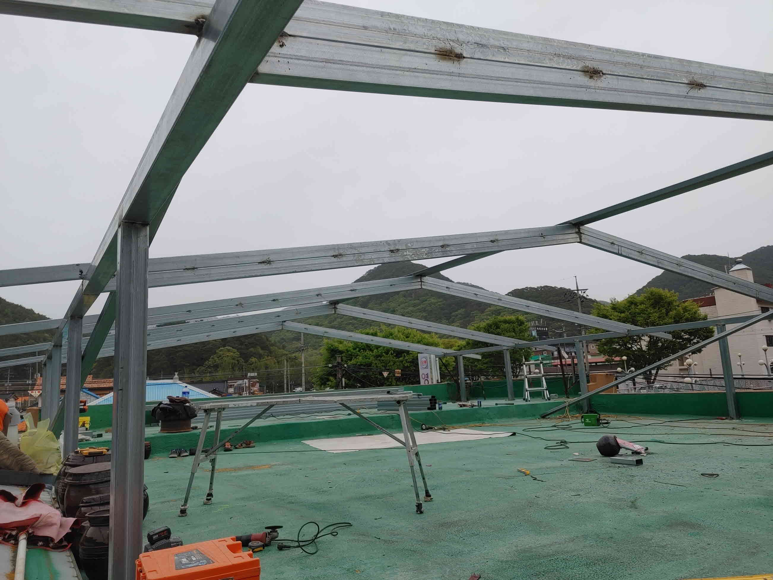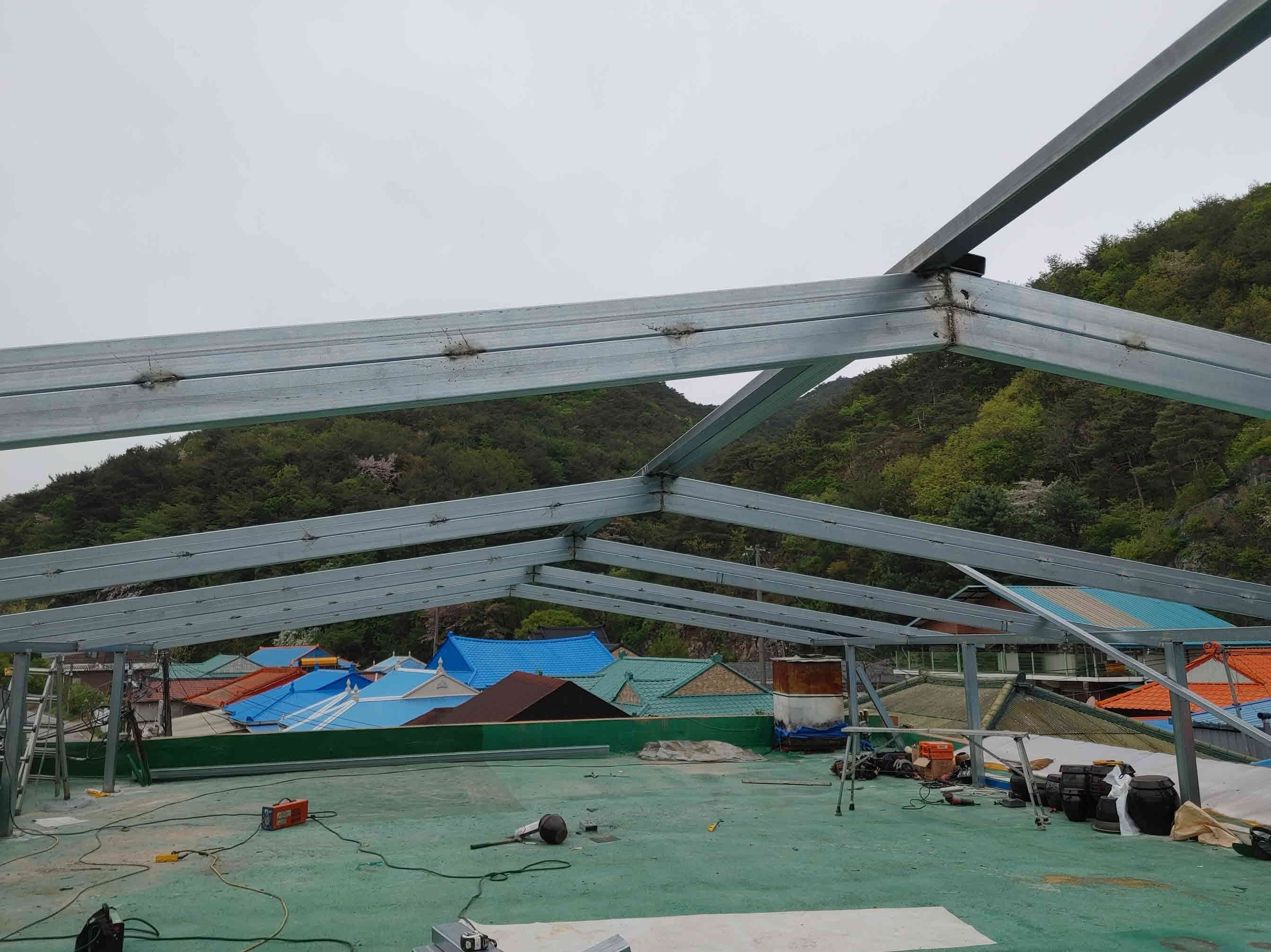 100*100 구조용 각관으로 기둥과 보를.. 100*50 각관을 두겹으로 해서 지붕틀을 만들어 시공합니다.