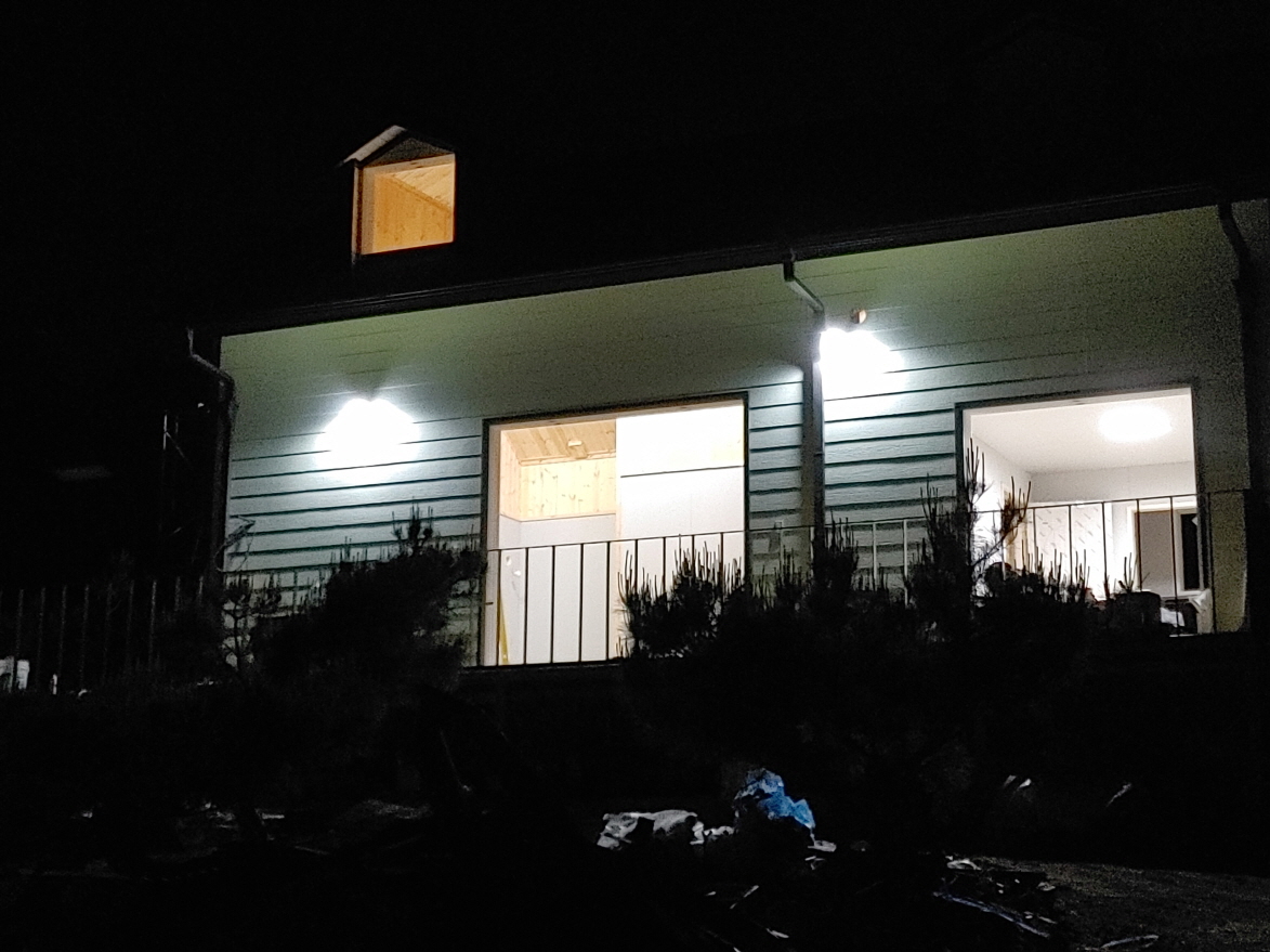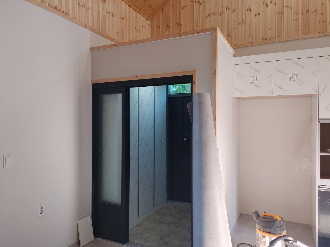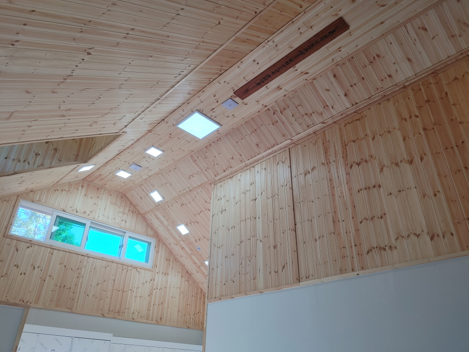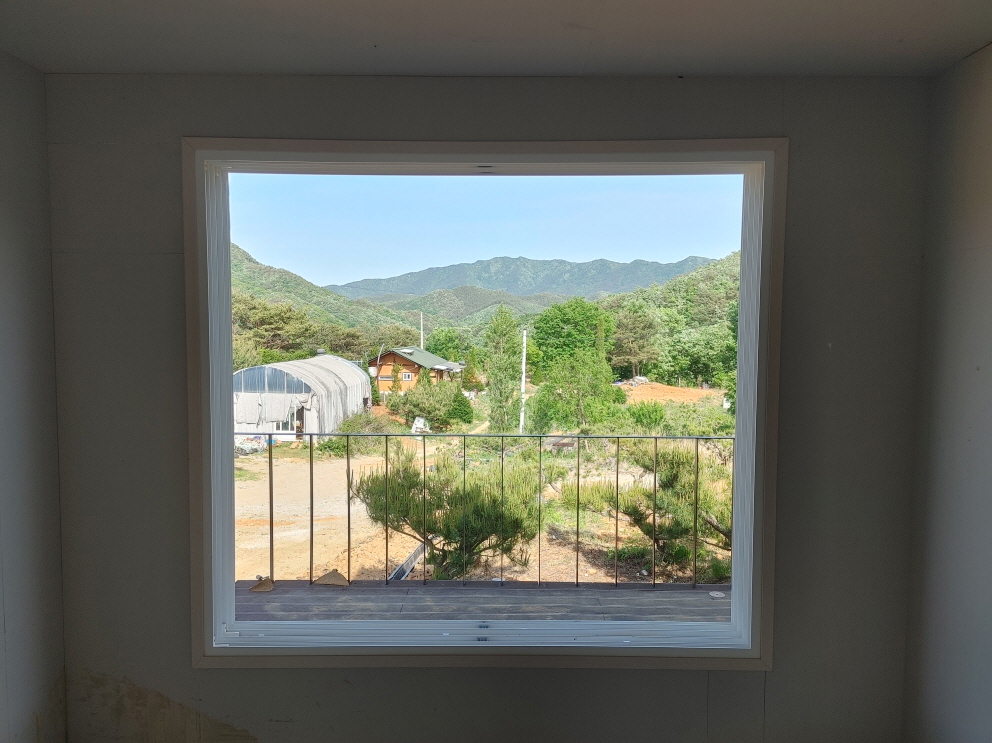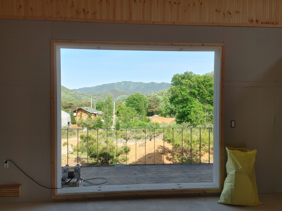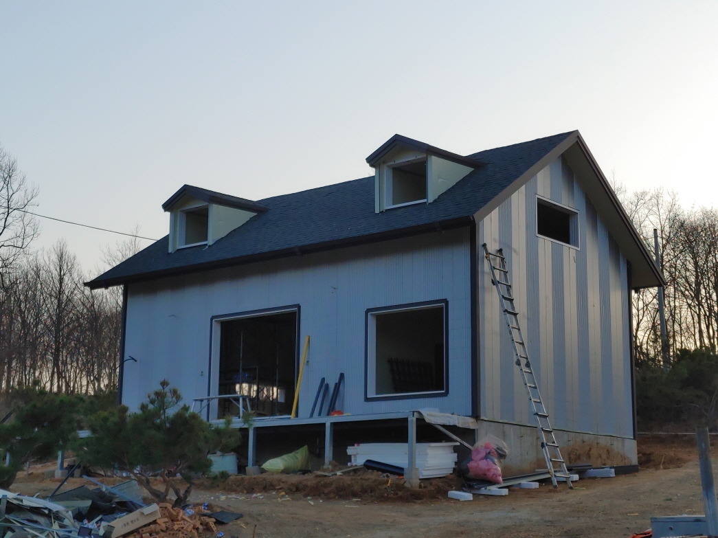 외벽은 100m/m 패널을 시공 후 시멘트 사이딩으로 마감하고 내벽에 한번 더 100m/m 패널을 이중으로 시공하고 석고보드 2P를 치고 목작업과 도배로 마감합니다.