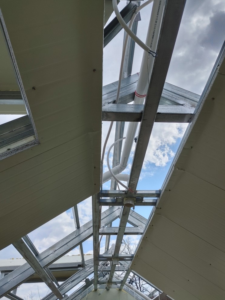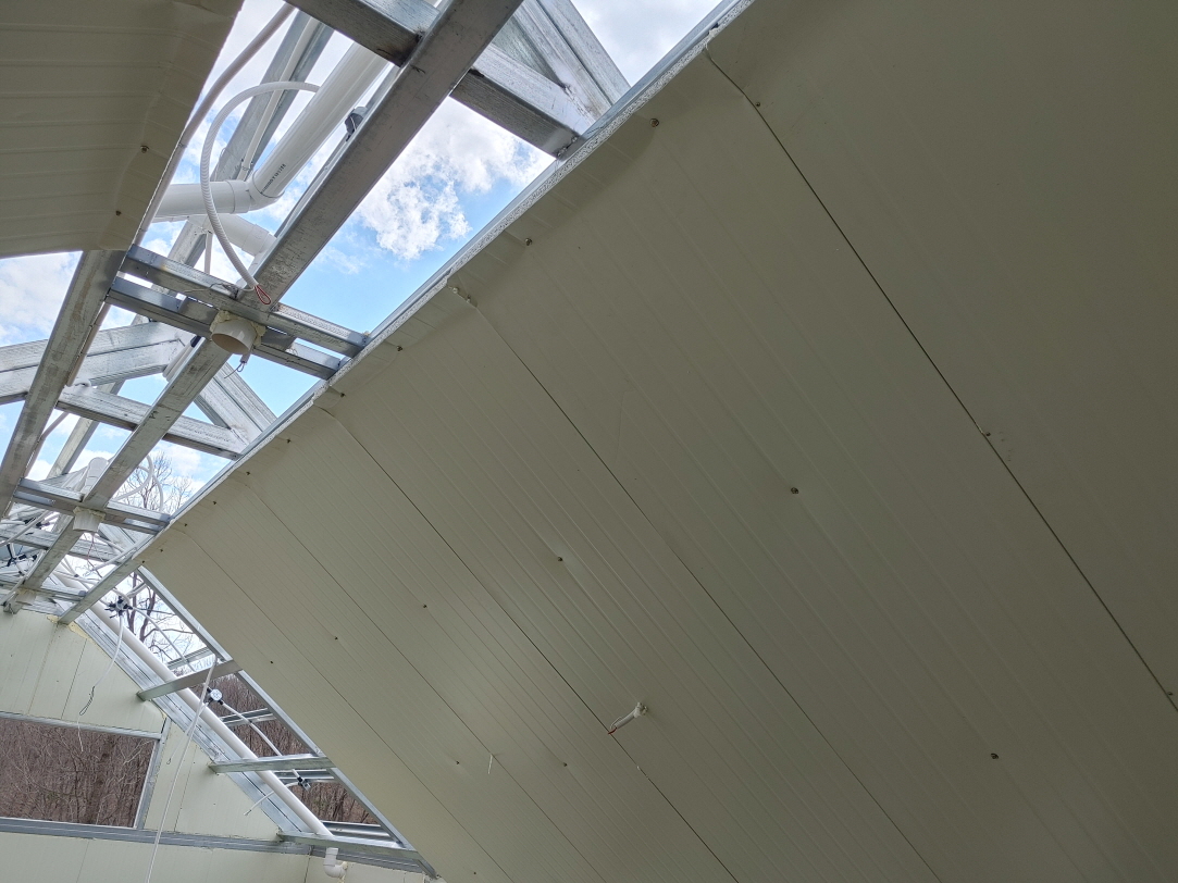 지붕 외부에는 150m/m, 트러스 내부에 100m/m, 천정에 다시 한번 100m/m 패널을 붙여 3중으로 지붕을 덮고