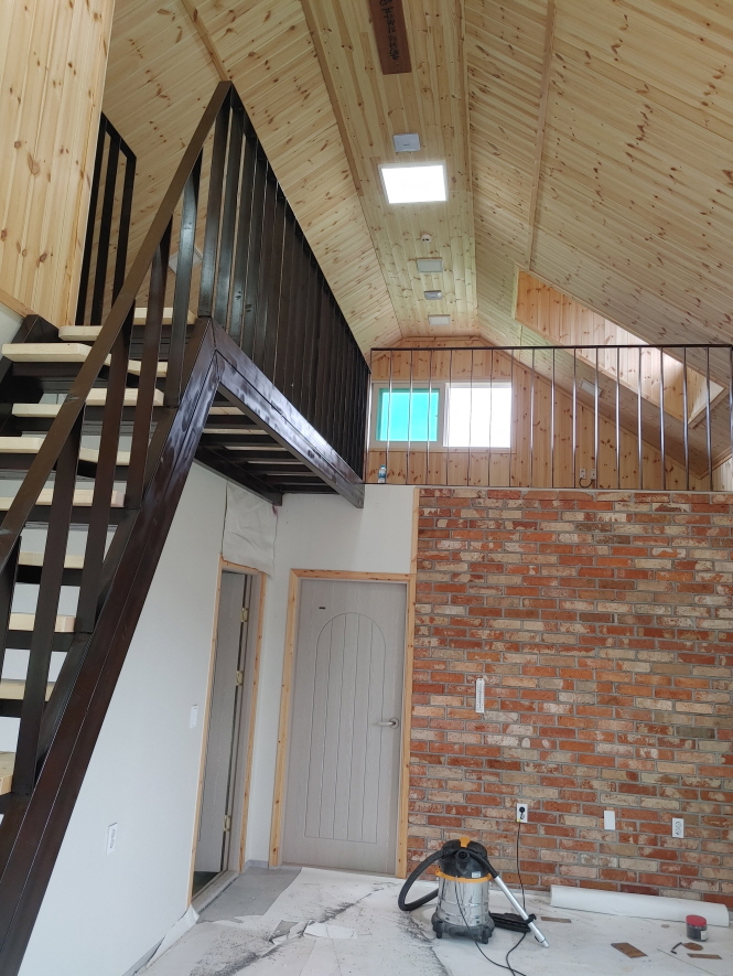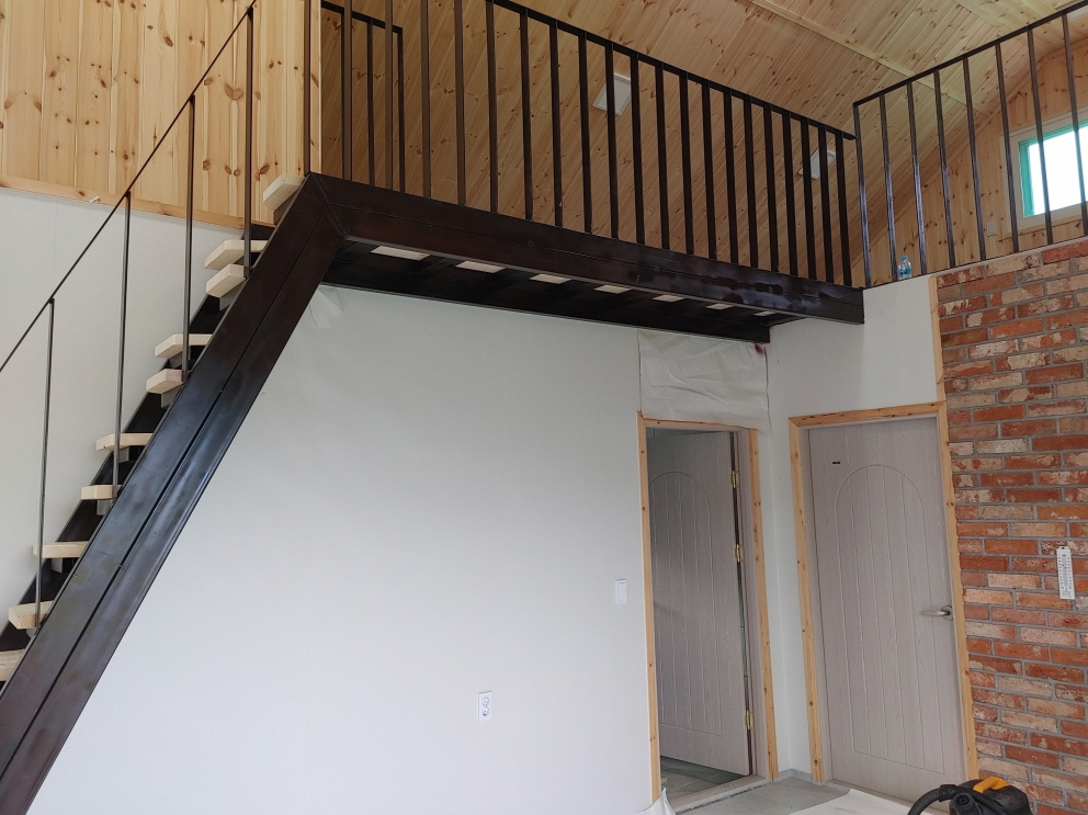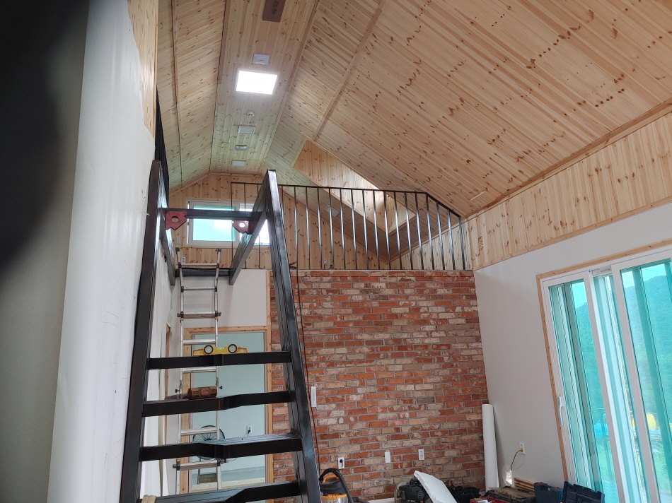 거실 및 주방은 오픈 천정으로.. 방과 욕실 윗 부분은 다락으로 사용할수 있도록 구조물을 세워 보강합니다.