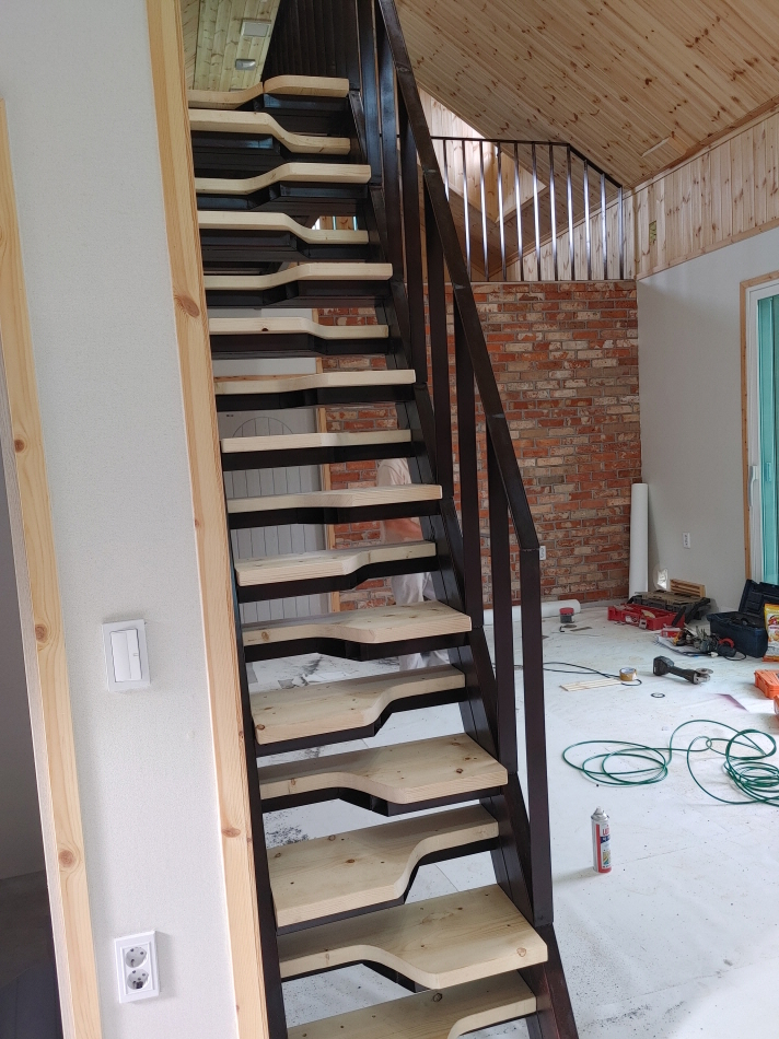 100*50 각관으로 뼈대를 잡습니다. 계단 아래는 쇼파를 놓아야 해서 경사를 세게하고 지그재그로 계단을 만들고 있습니다.