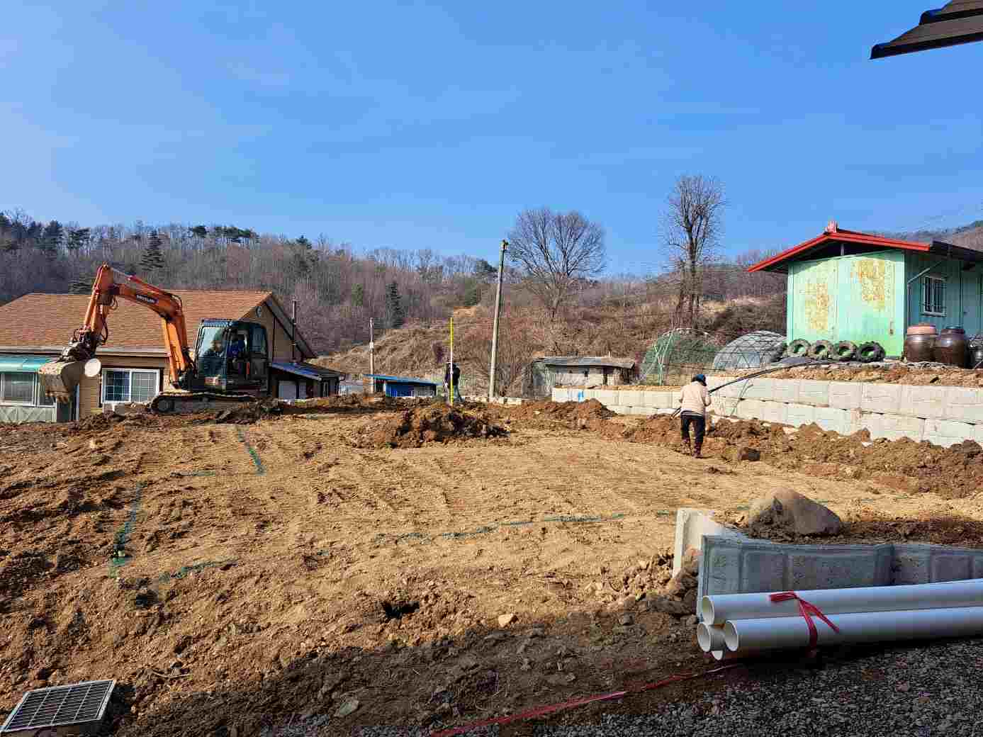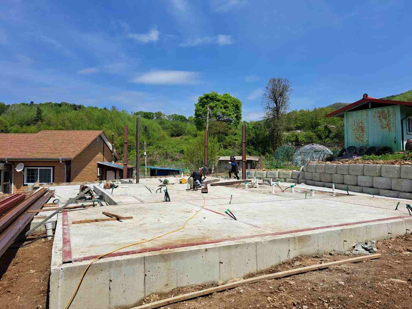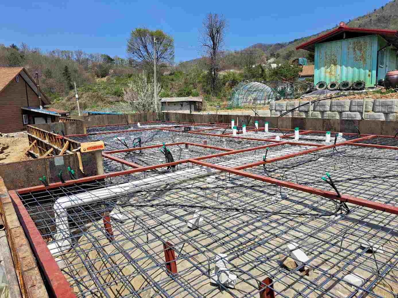 배근을 하고 하수, 오수 배관 및 전기 배관까지 끝내고 이제 레미콘 타설 준비중입니다.