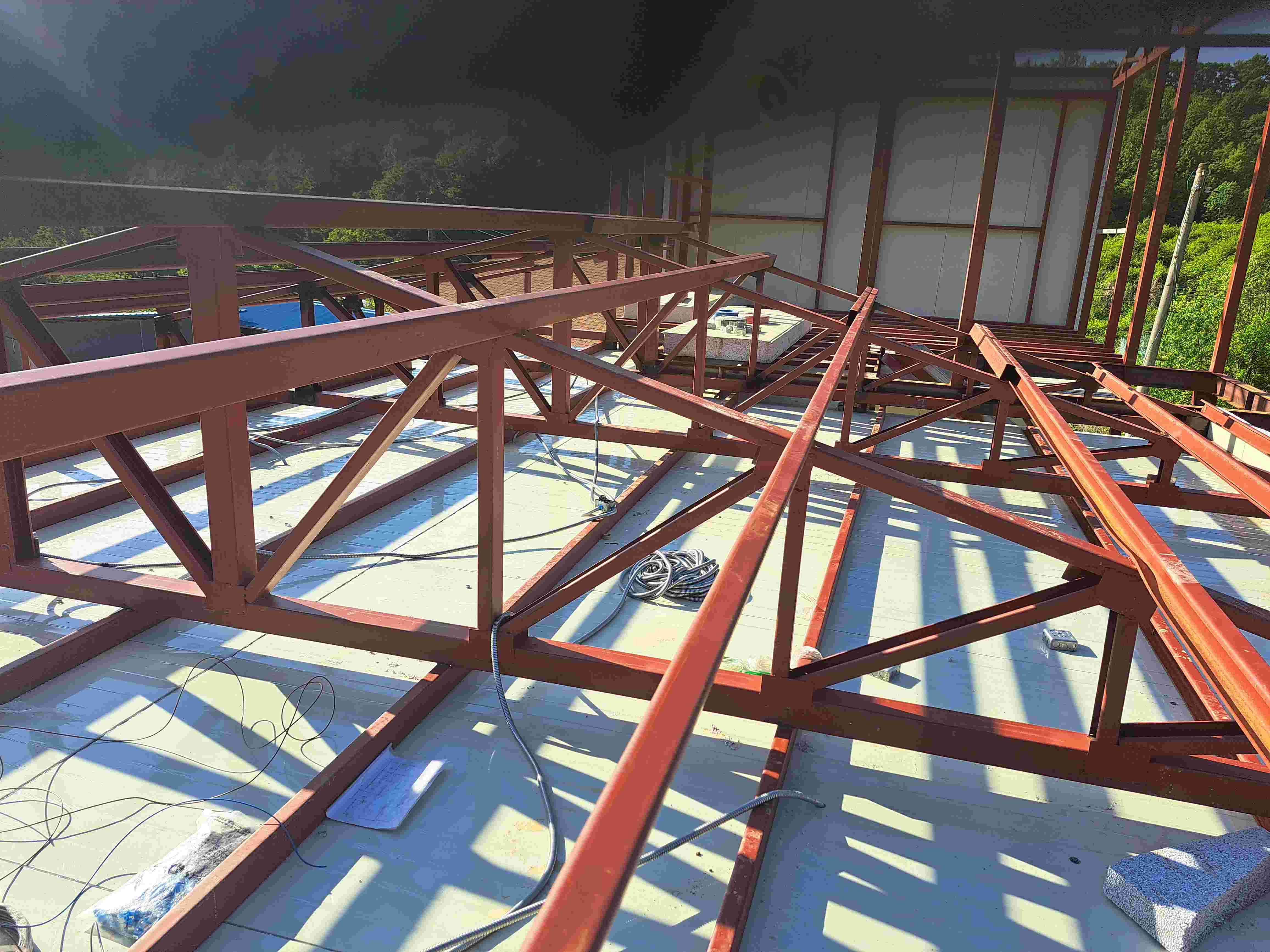 바닥에서 완성된 지붕 골조를 크레인을 이용하여 올립니다.