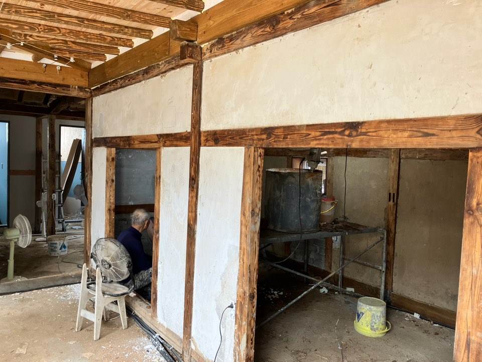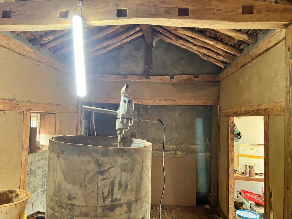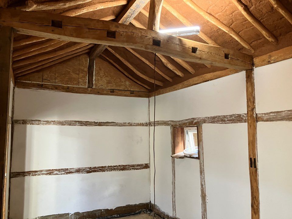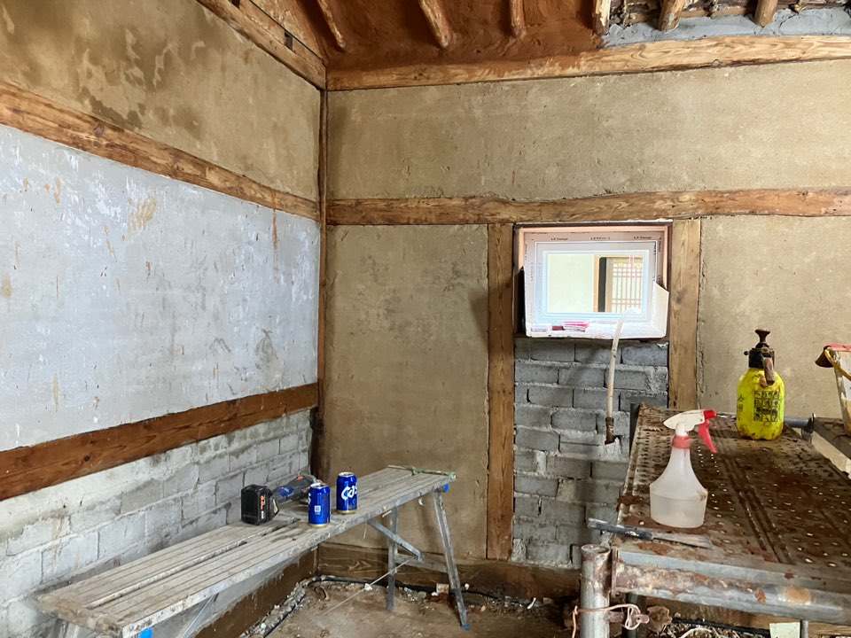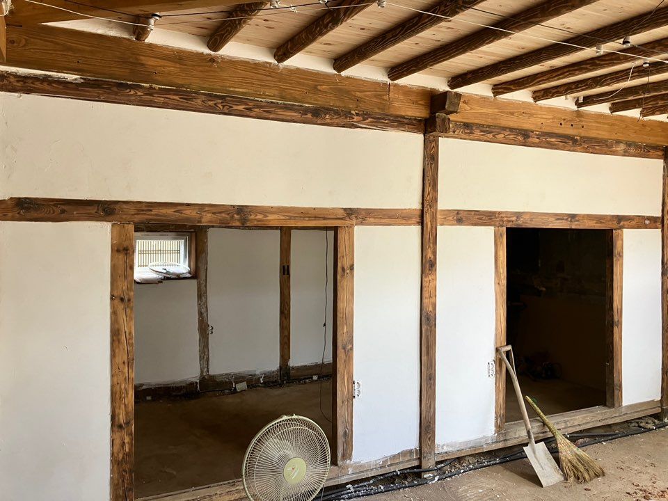 무너진 벽은 벽돌을 쌓아 보강하고 천정을 뜯어 내어 서까래가 들어난 부분엔 황토흙을 바릅니다.