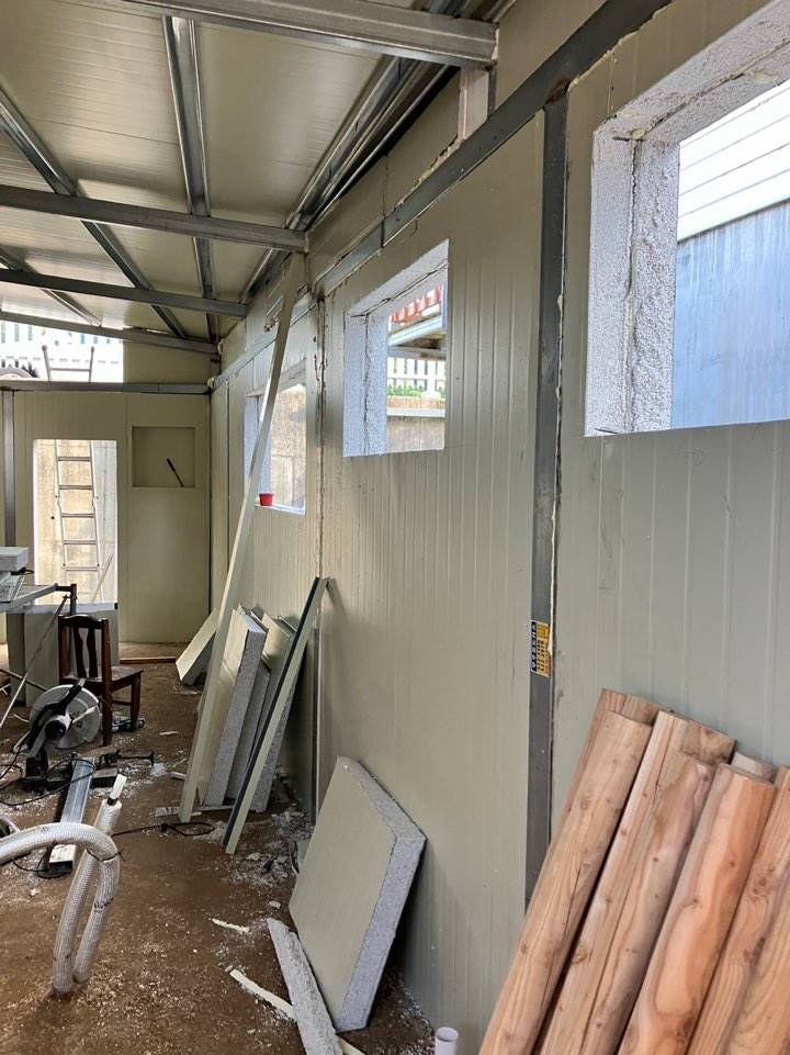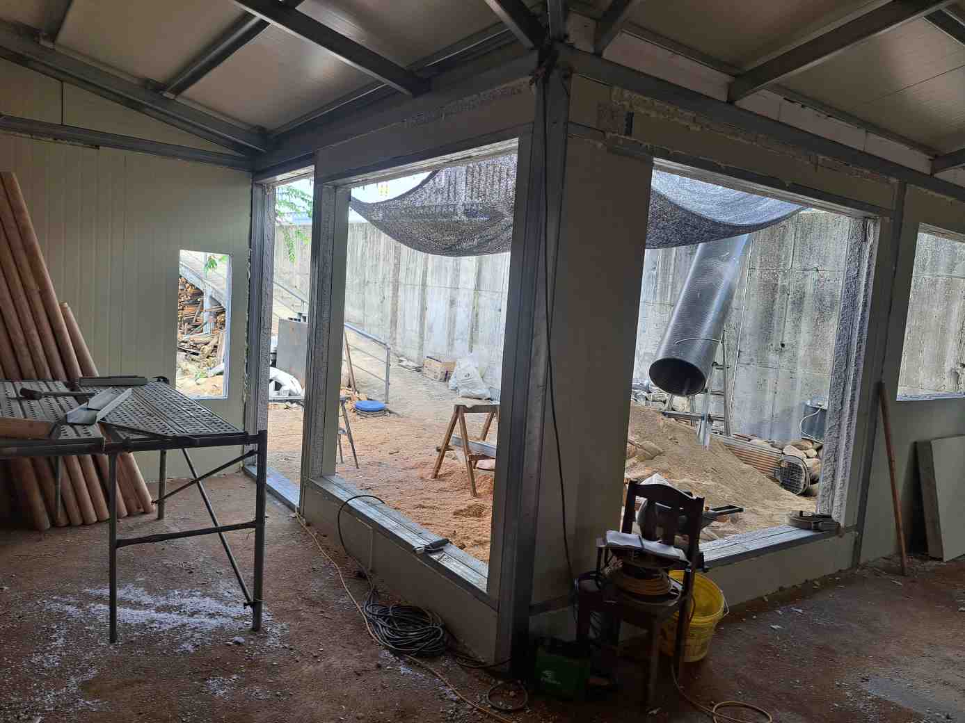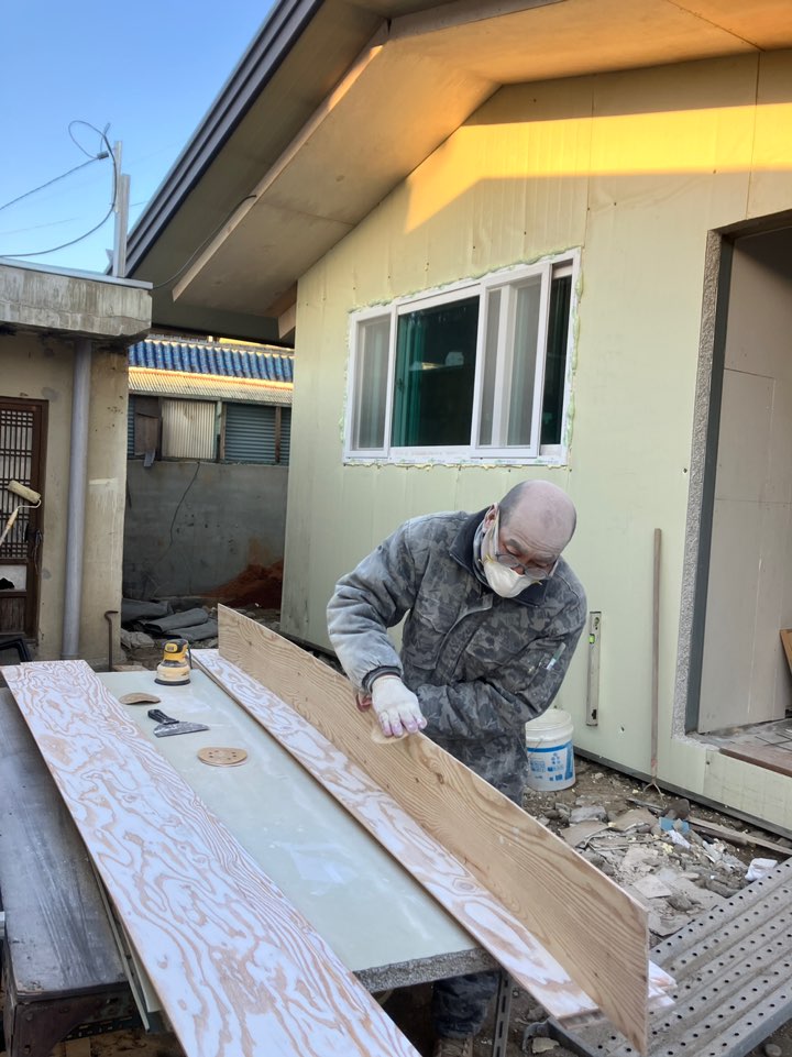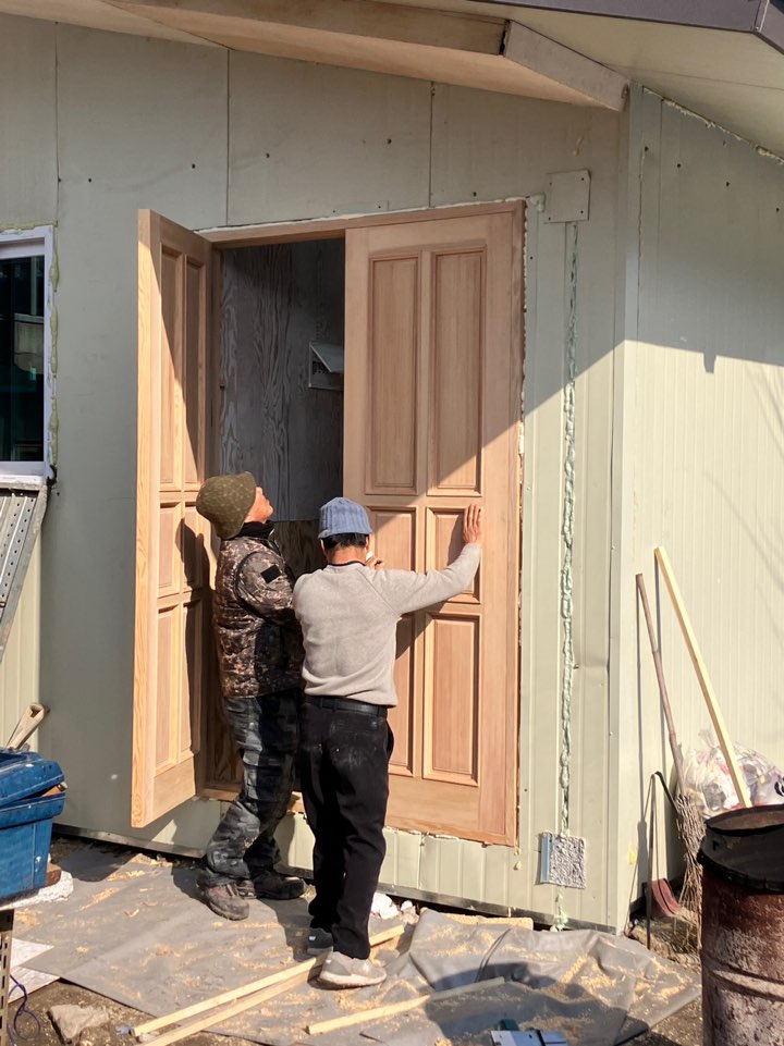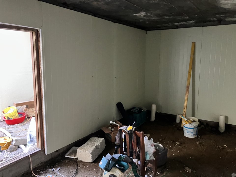단열을 주 목적으로 좁은 방도 확장할겸 외벽을 샌드위치 패널 100m/m를 2중으로 시공하고 이중창에 22m/m 복층유리를시공할 계획입니다. 현장 상황 상 레미콘을 받기가 어려워 시멘트를 직접 비벼 수작업으로 바닥 공사를 하고 있습니다.
