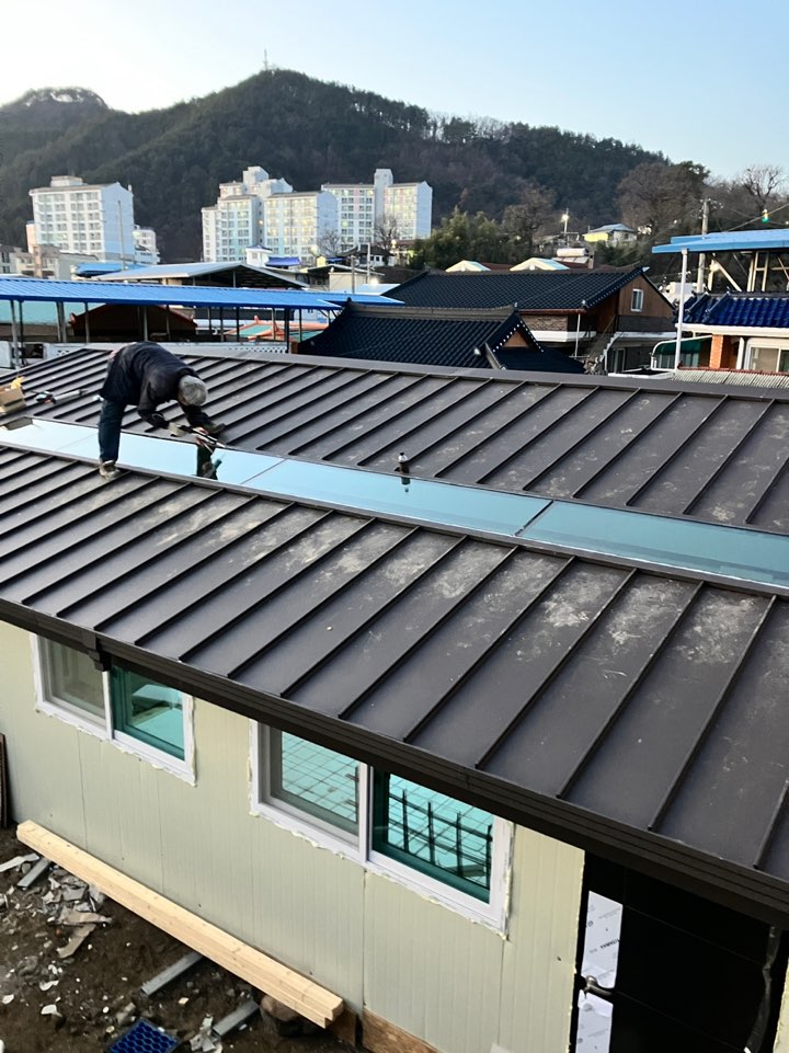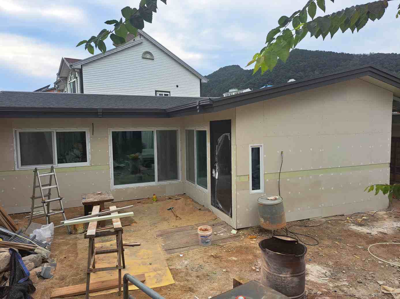 지붕 마감은 건축주와 상의 후 돌기와를 시공하고 싶었으나 자재 수급의 어려움과 높은 가격으로 인해 이중싱글로 가기로 하였고 벽체 외부는 시멘트 보드에 스타코를 시공하고 도리 및 기둥을 시공하여 한옥의 멋을 살려 볼 예정입니다.